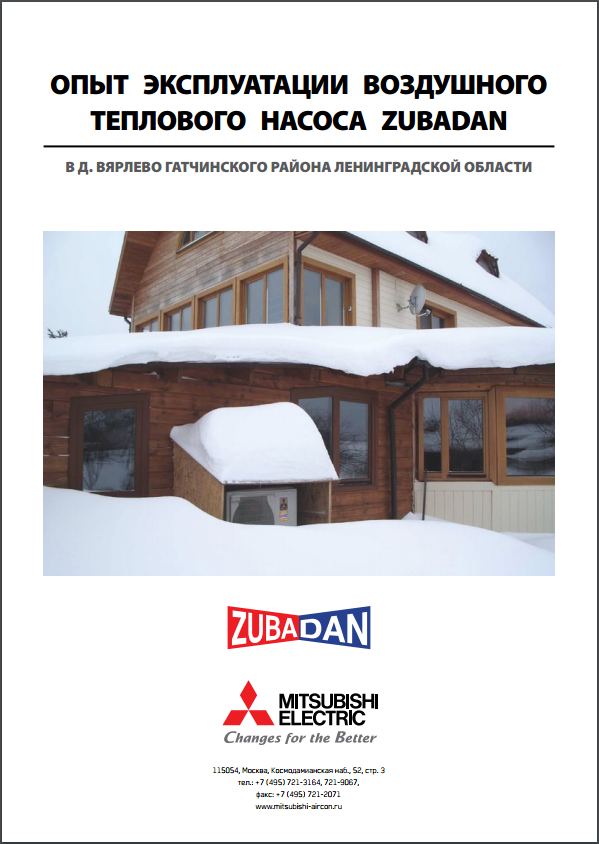 Воздушный тепловой насос ZUBADAN (Mitsubishi Electric) установлен в частном доме в д. Вярлево Гатчинского района Ленинградской области. Cистема обеспечивает отопление и нагрев воды для санитарного использования. В издании отражены технико-эксплуатационные показатели использования воздушного теплового насоса, а также сравнение финансовых затрат при основных видах отопления частного дома.