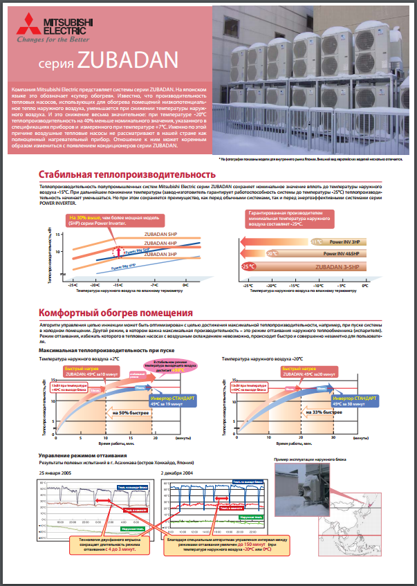 Теплопроизводительность полупромышленных систем Mitsubishi Electric серии ZUBADAN INVERTER (Зубадан инвертор) сохраняет номинальное значение вплоть до температуры наружного воздуха -15°С. При дальнейшем понижении температуры (завод-изготовитель гарантирует работоспособность системы до температуры -25°С) теплопроизводительность начинает уменьшаться. Но при этом сохраняется преимущество, как перед обычными системами, так и перед энергоэффективными системами серии POWER INVERTER.