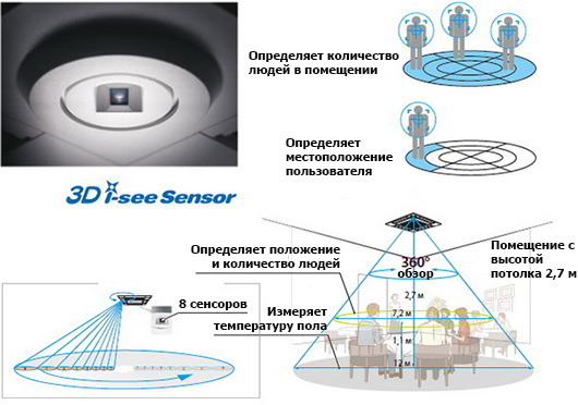 Датчик I-SEE, установленный в углу декоративной панели, представляет собой тепловизор с восемью чувствительными элементами, расположенными вертикально. Каждые три минуты механический привод поворачивает датчик на 360°, и микроконтроллер кондиционера считывает и запоминает трехмерную температурную картину помещения. Сравнивая сделанные последовательно тепловые «снимки», встроенный алгоритм находит несовпадение тепловых пятен и распознает их как людей. Далее, в зависимости от предпочтений пользователя, воздушный поток направляется на человека или, наоборот, отклоняется в сторону. Поток направляется на статические нагретые или охлажденные зоны помещения для выравнивания температуры.